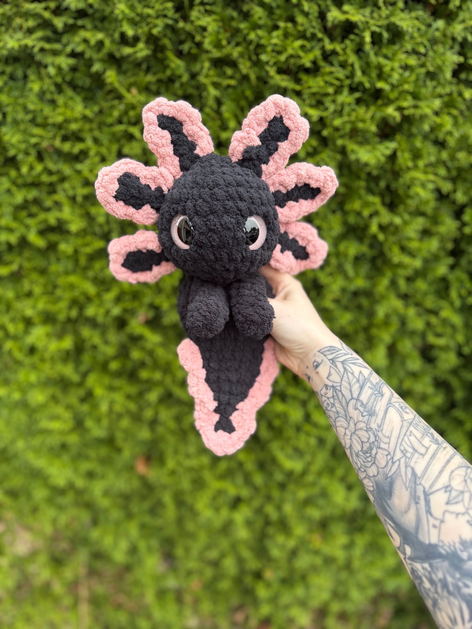 Axolotl snuggler is made with soft Big Twist Plush yarn and measures approximately 13.5 inches in length.