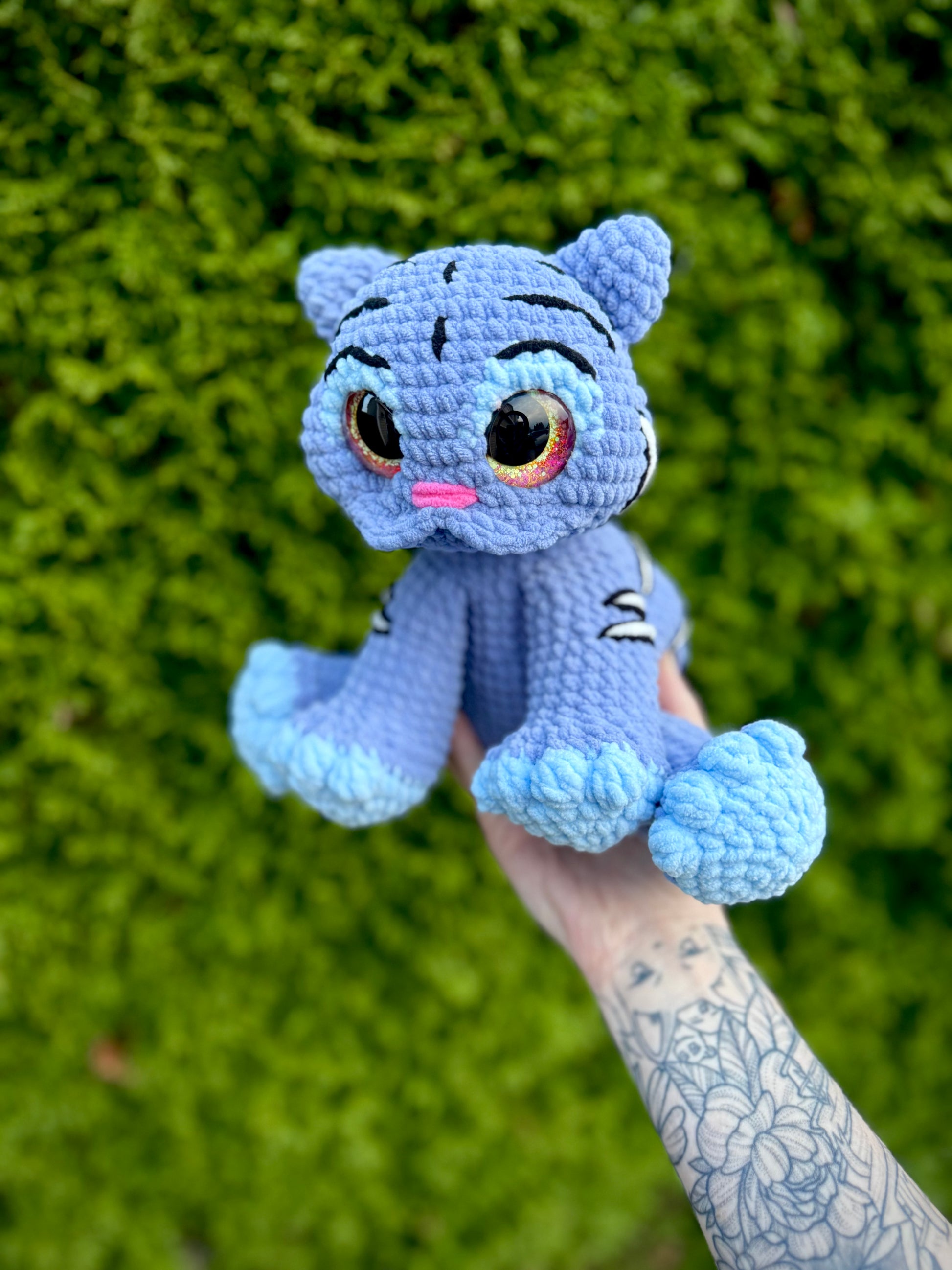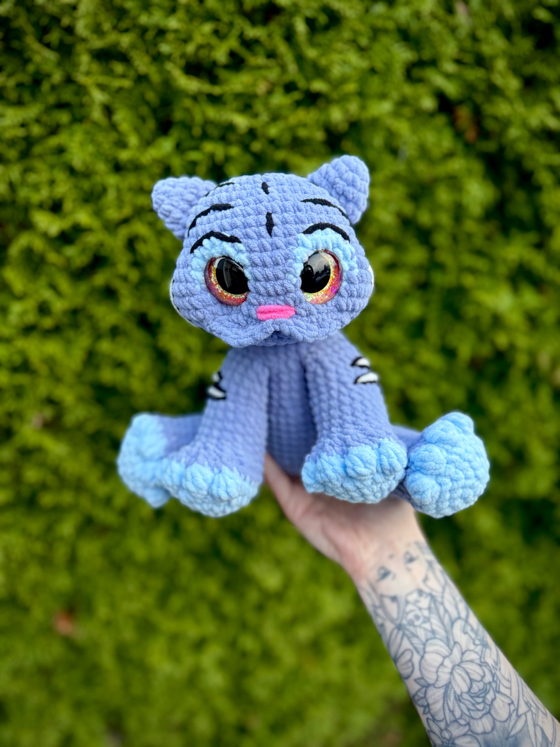 Derpy Tiger is made with soft posh yarn and sits approximately 10 in tall.