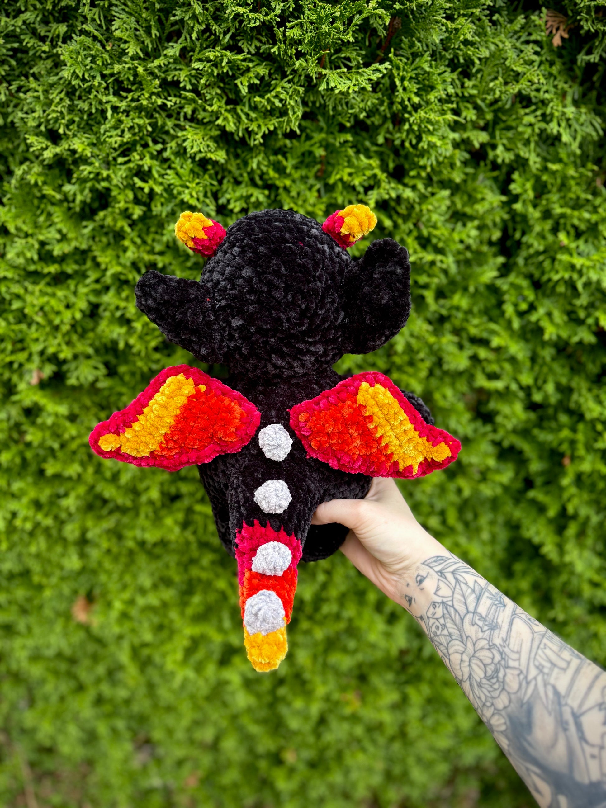 Dragon buddy is made with soft velvet yarn and stands approximately 13.5 inches tall.