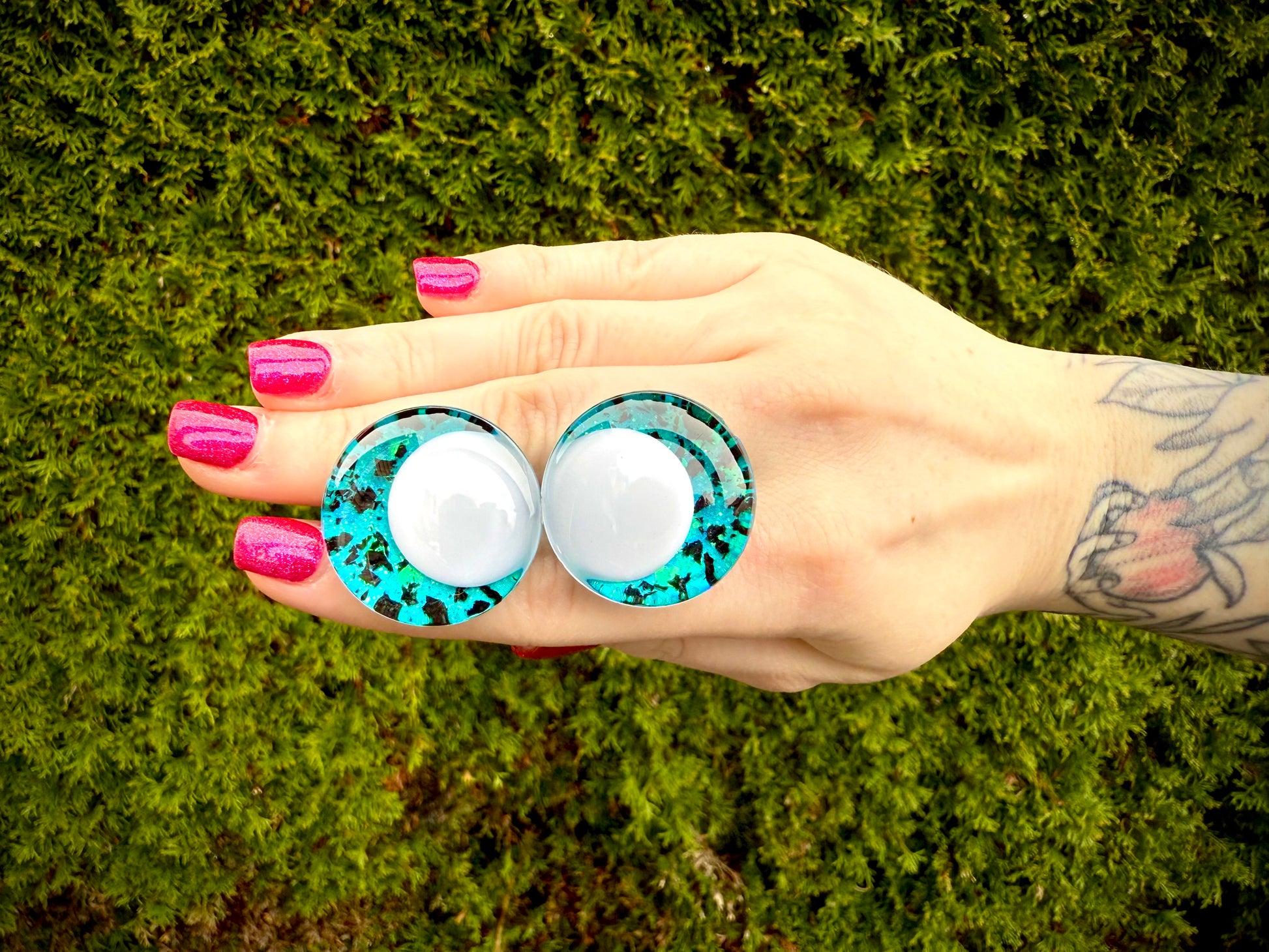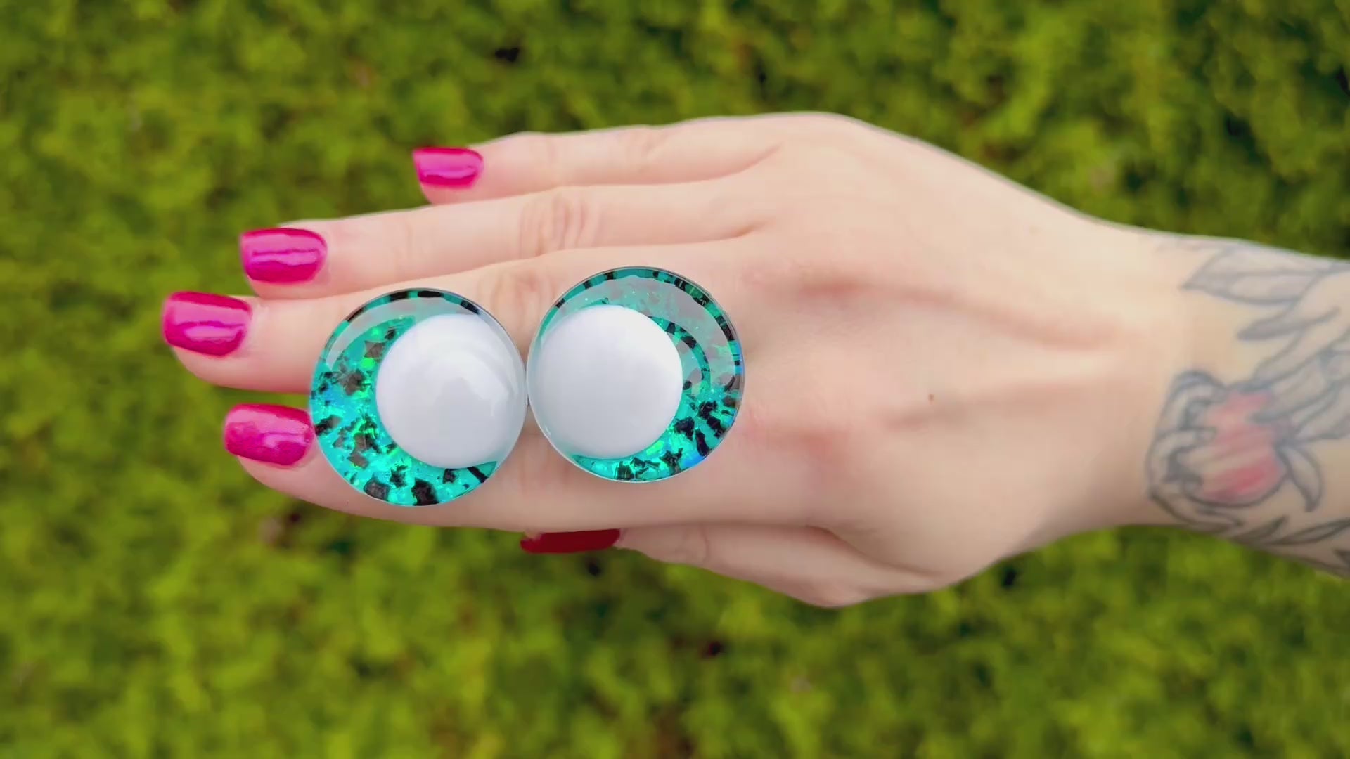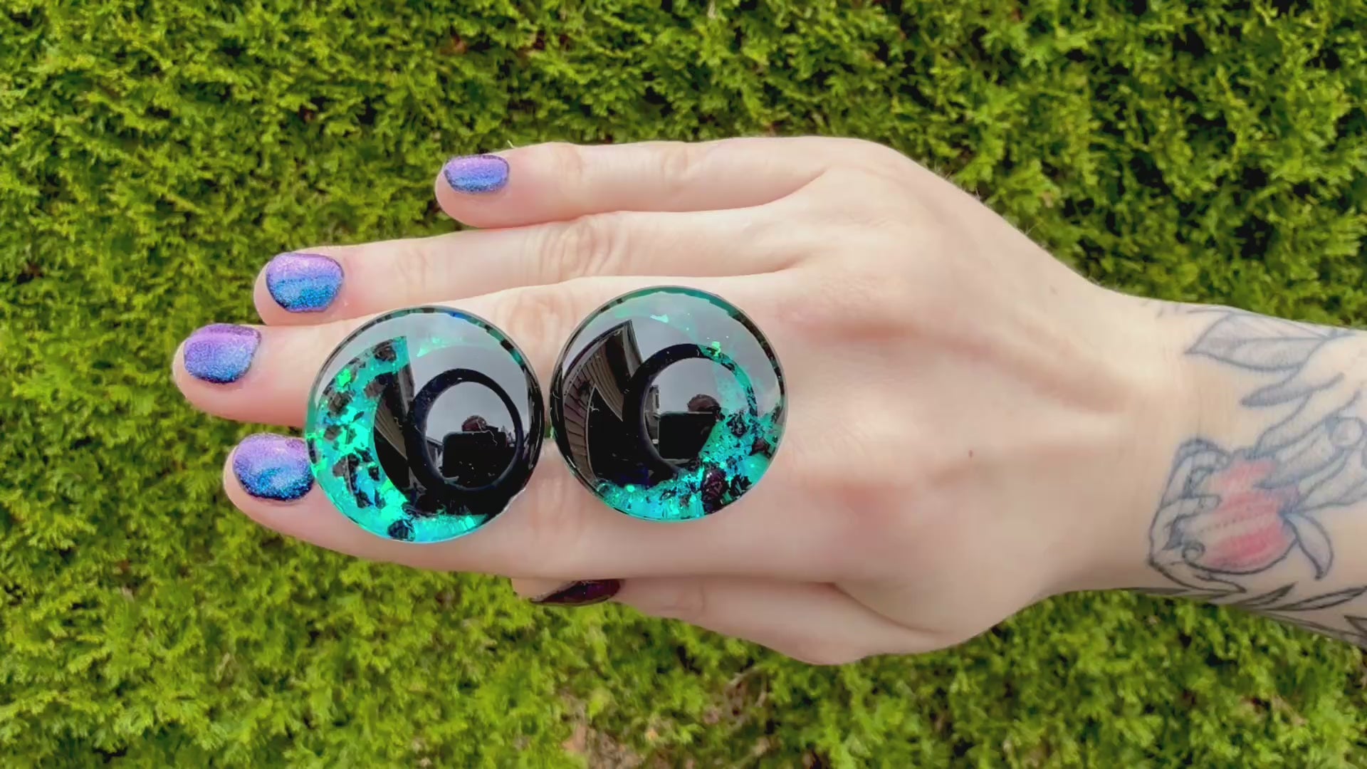 The Kaiju safety eyes are inspired by the anime Kaiju No. 8, Kafka Hibino gains the ability to become a humanoid kaiju. As a Kaiju, he appears as black and neon teal/aqua blue. From the moment I first saw his Kaiju form, I instantly had a vision for these eyes and I am happy I was able to bring this design to life! These eyes feature black metallic flakes and color shifts of teal and aqua.