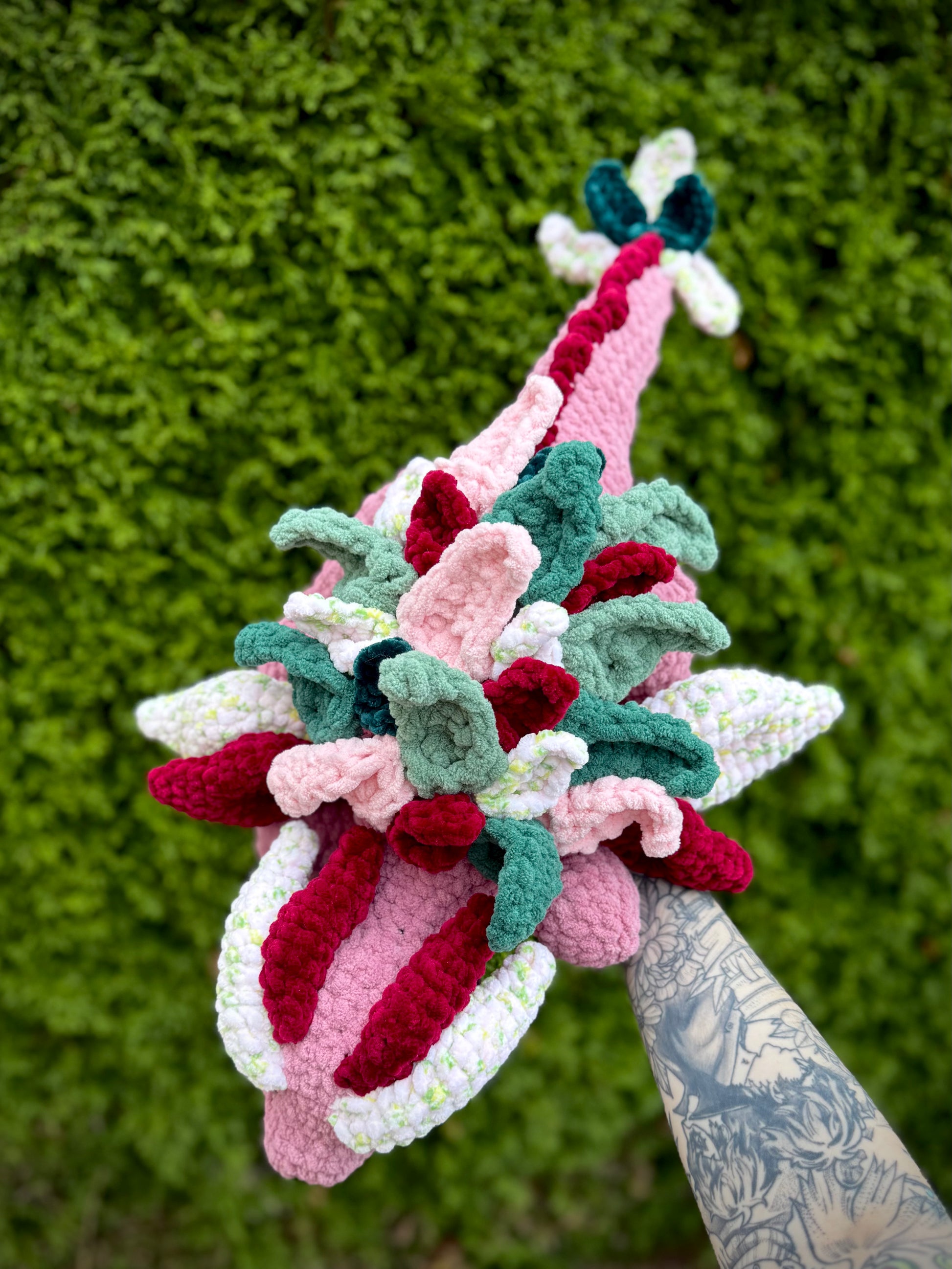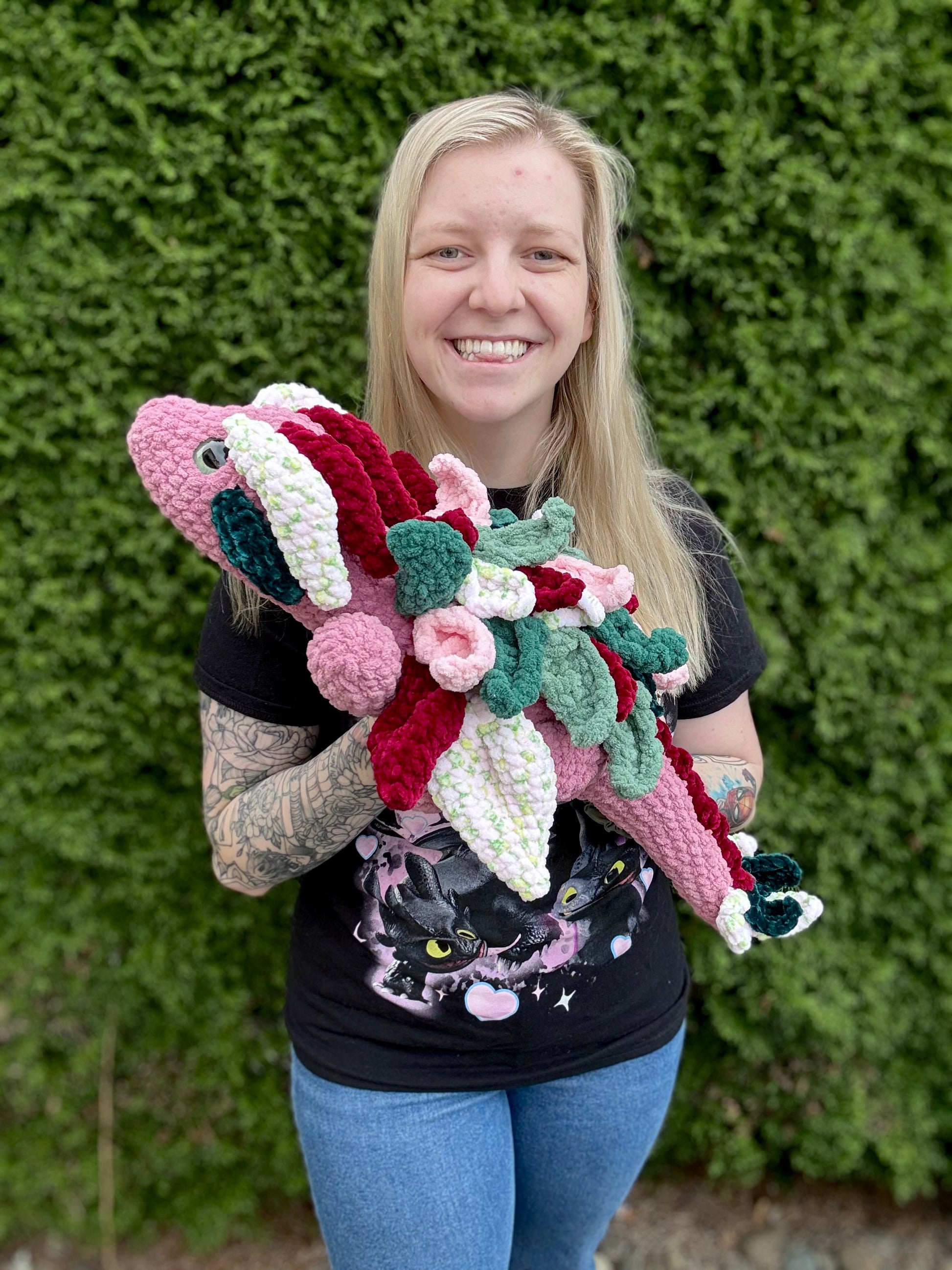 Laying nature dragon is made with soft blanket, chenille, and blanket yarn and measures approximately 27.5 inches in length.